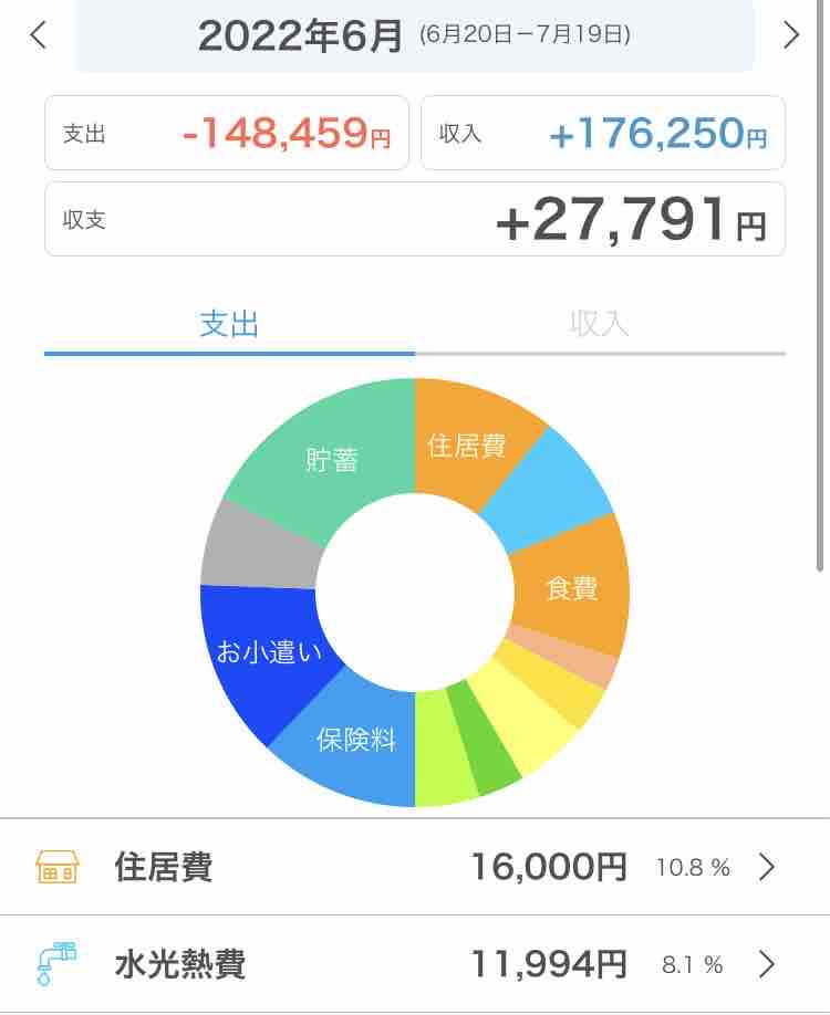 また、出費がなかったのでグラフ内に項目がありませんが、交際費・レジャー費共に1円も出費なしです。