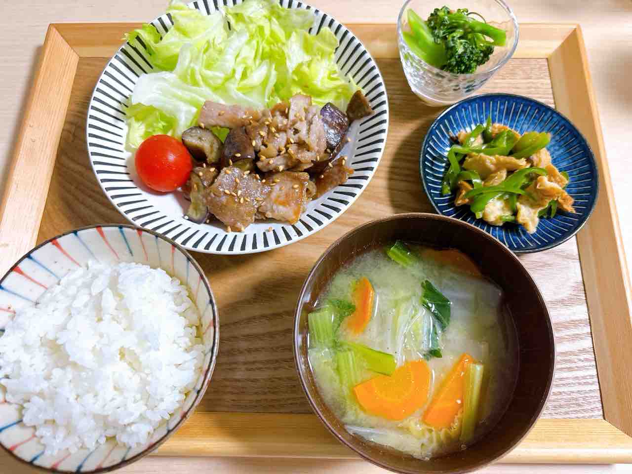 具沢山のお味噌汁に、ナスと豚肉の炒め物、ブロッコリーまで…
