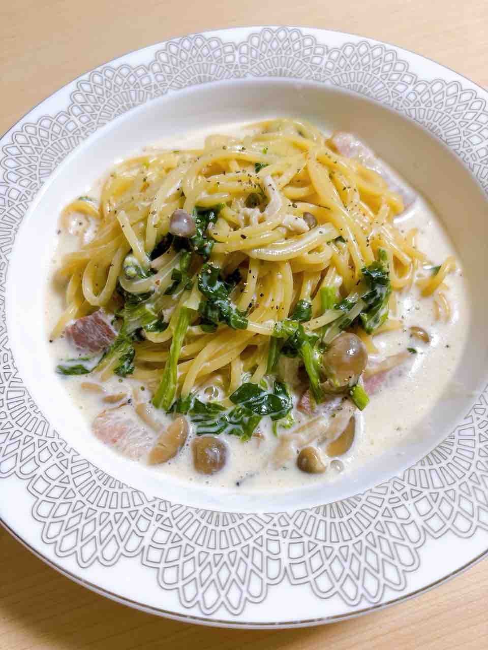 昼食のクリームパスタ、美味しそうです!(^^)!