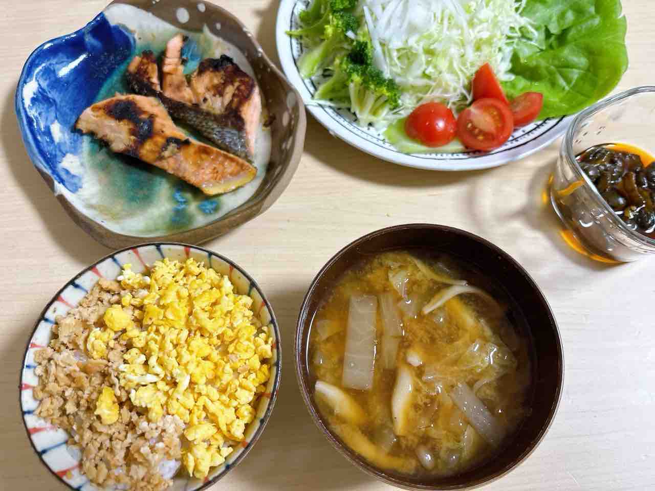 メニューはそぼろ丼と魚、サラダにお漬物です。
